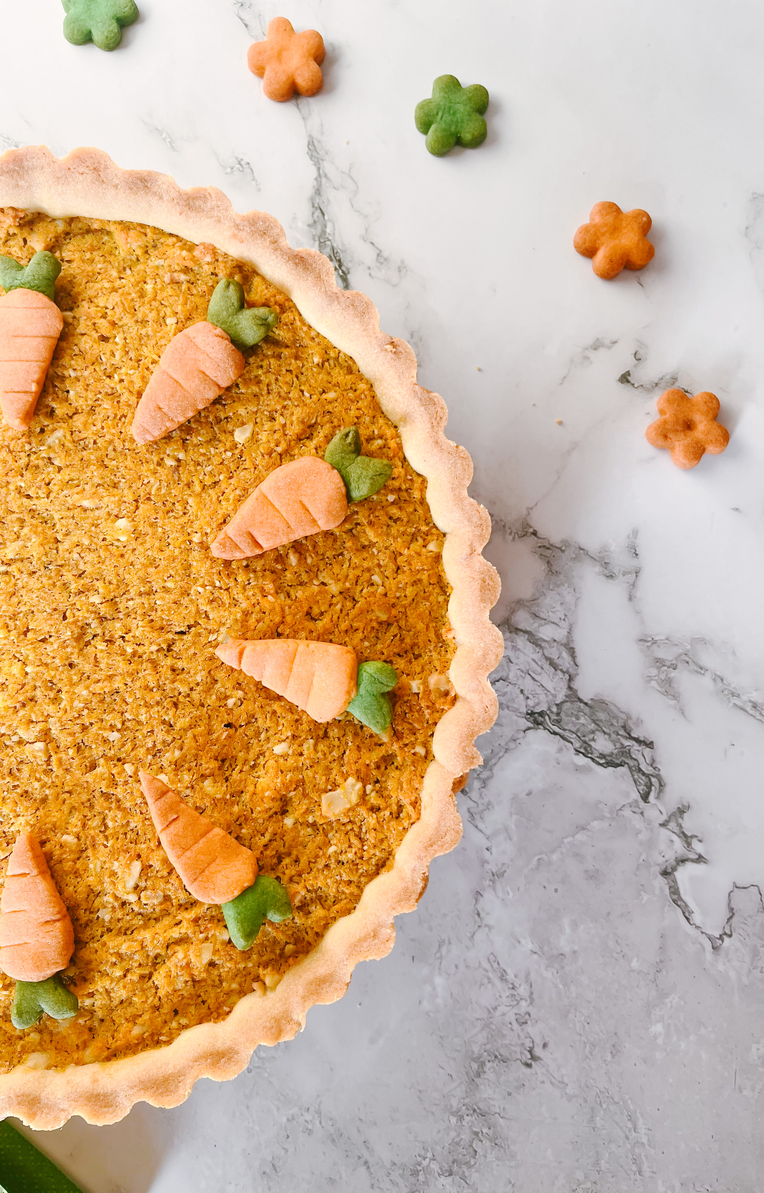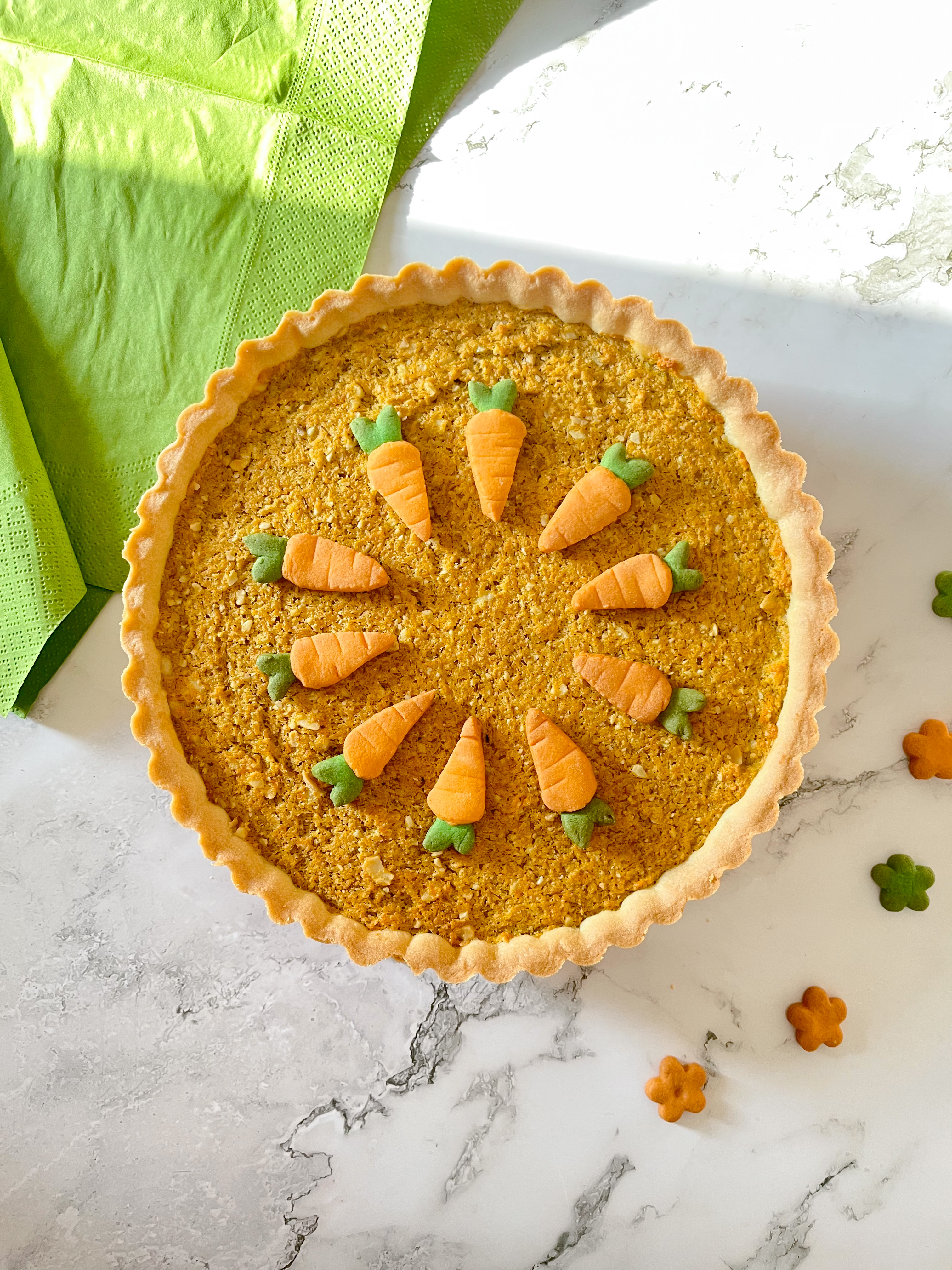 Sfornate la carotata e le carote in pasta frolla e decoratela come più vi piace. Io ho optato per un cerchio di carote 😉