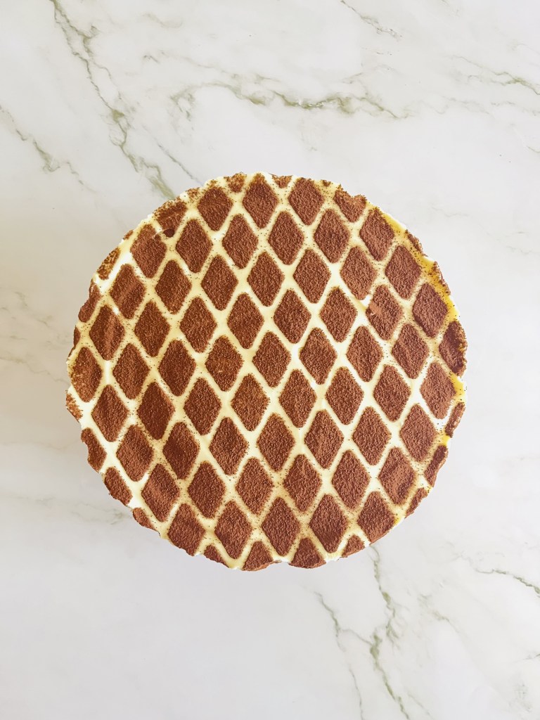 Estraete la torta dal frigorifero, rimuovete l’anello e la carta forno e trasferite il dolce su un piatto da portata. Cospargete la superficie con del cacao nel modo in cui preferite. Io, prendendo ispirazione da LuCake, ho usato la griglia taglia pasta di decora come supporto per creare la decorazione!