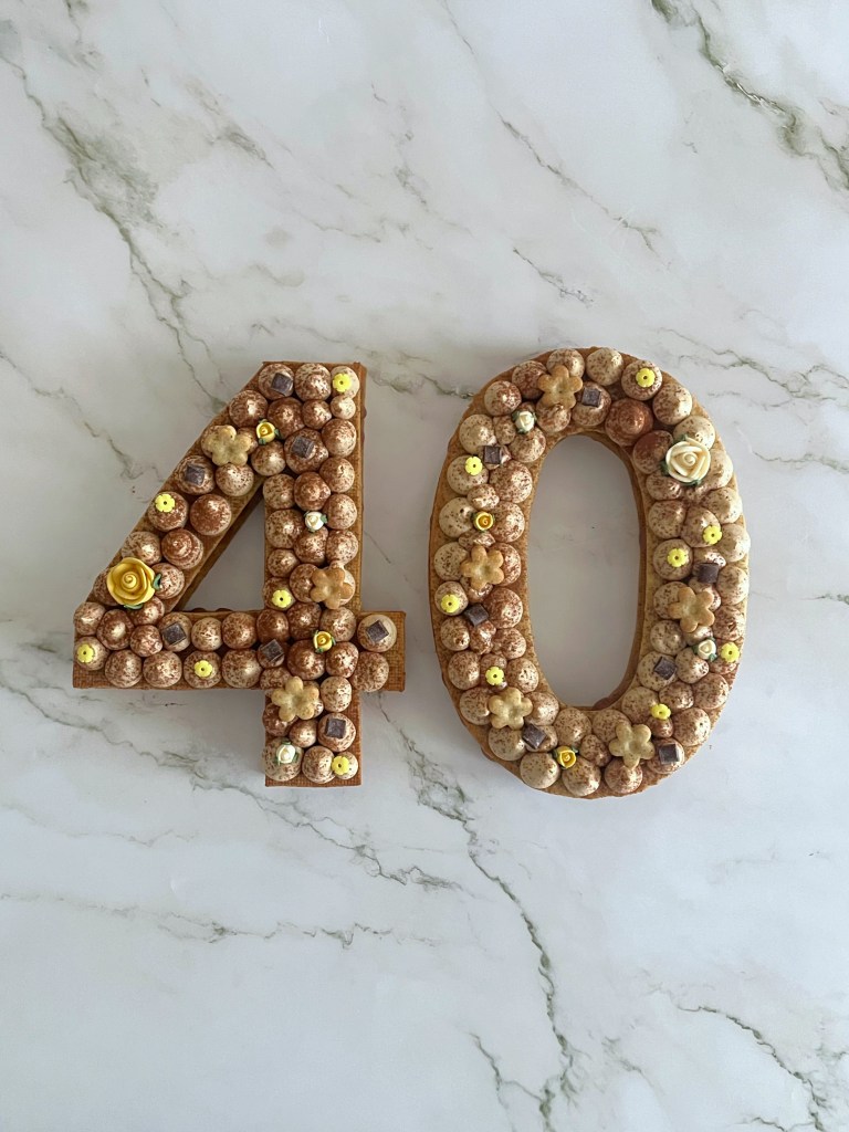 - Ripetete la stessa operazione per entrambi i numeri e terminate la decorazione con una spolverata di cacao amaro, pepite di cioccolato e fiori di zucchero. In realtà potrete scegliere la decorazione che più preferite, è questo il bello di queste torte!