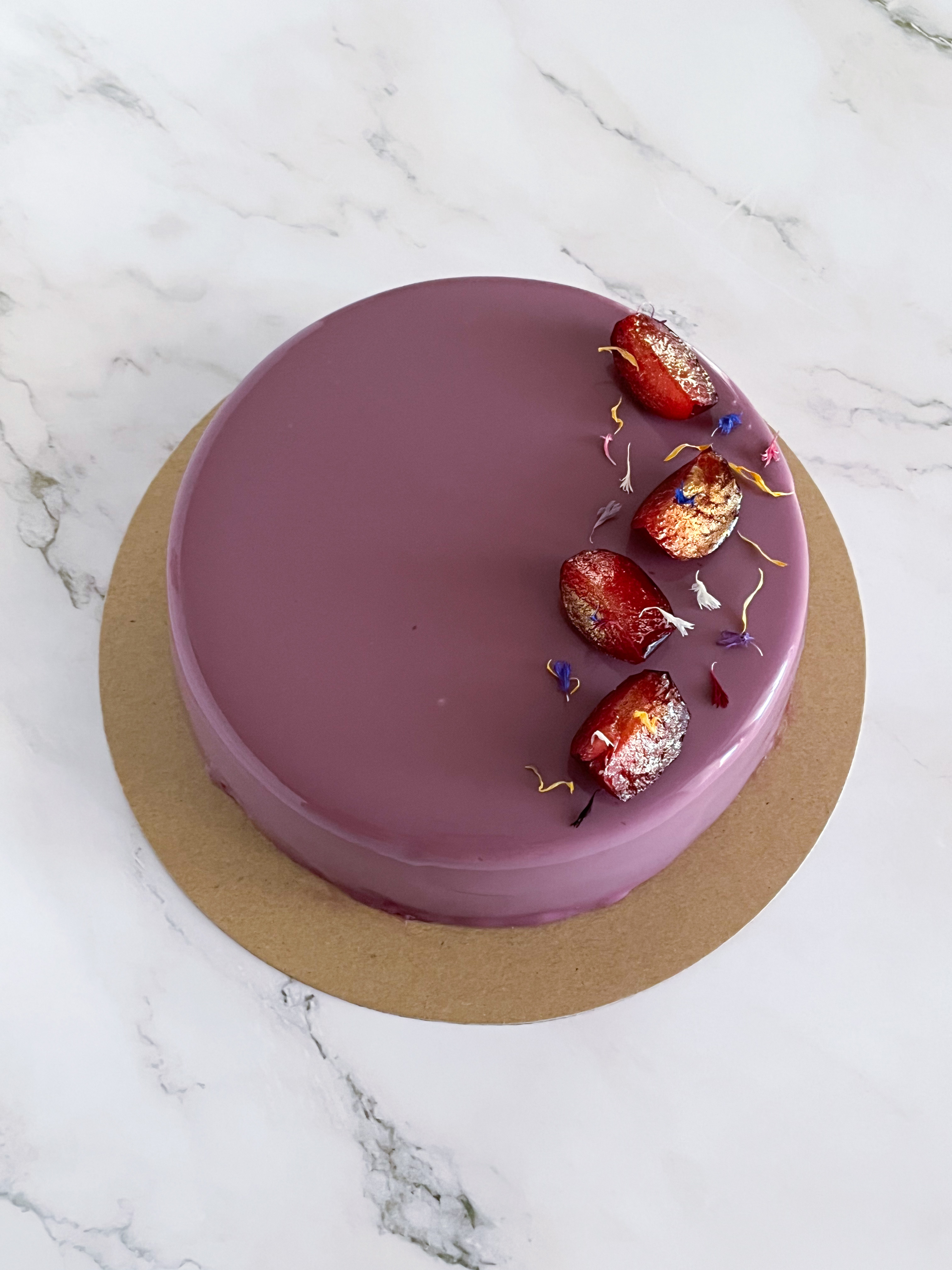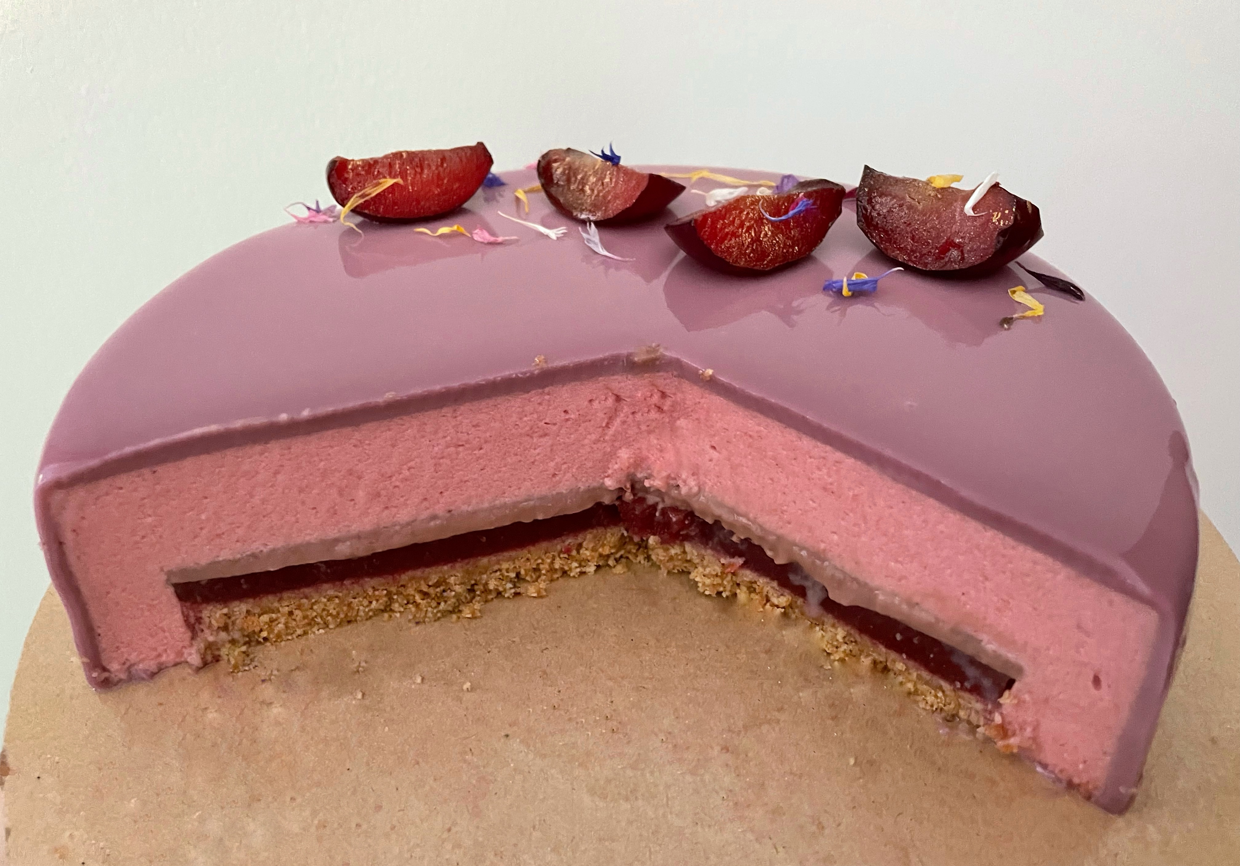 Ho adorato il colore della mousse alle susine, così tanto che mi sono quasi pentita di averla glassata, se la dovessi rifare opterò per un Nappage neutro, ma devo dire che sono anche molto soddisfatta del colore ottenuto dalla glassa a specchio.