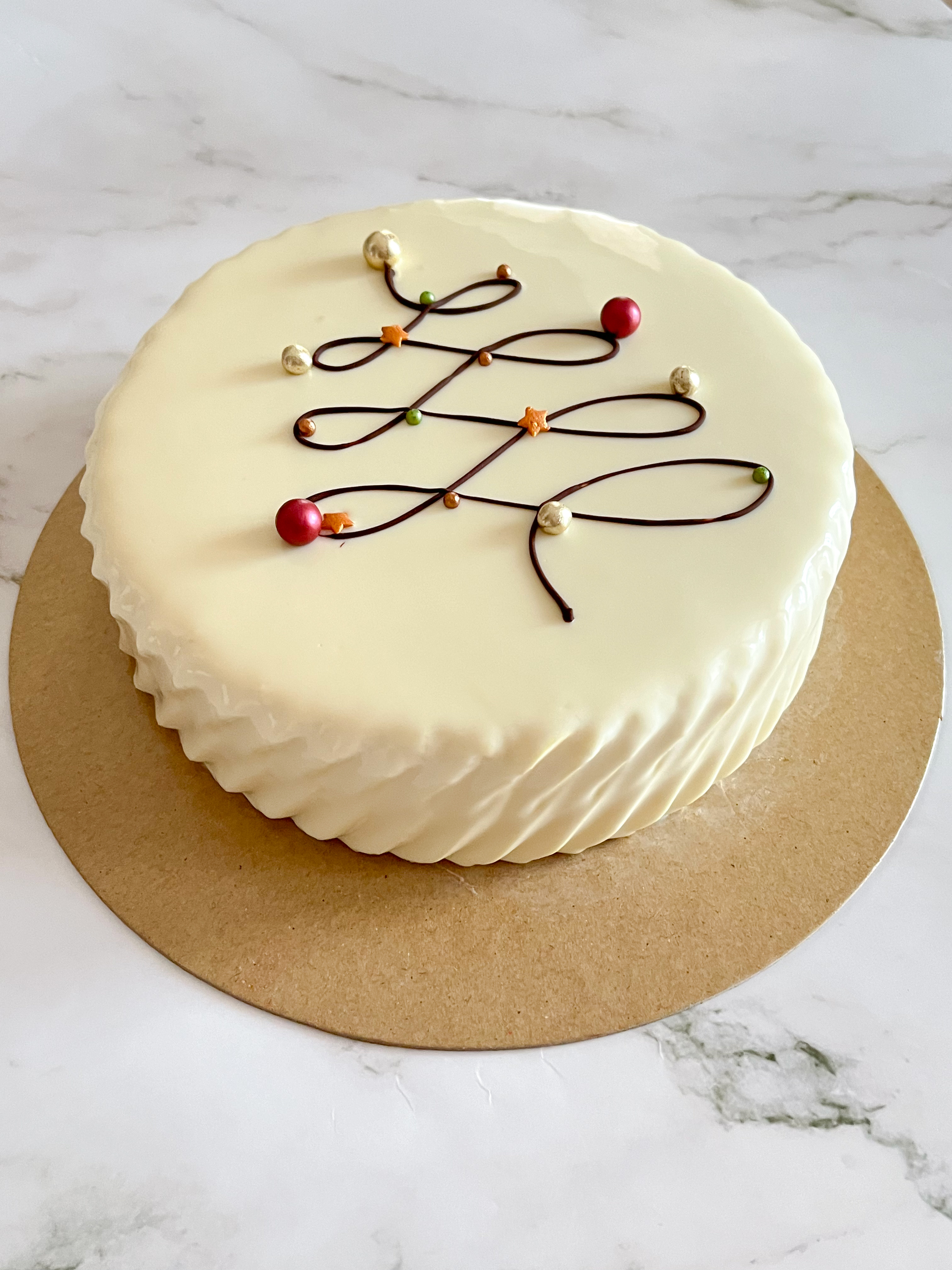 - Trasferite la torta nel frigorifero per 2-3 ore in modo tale che la glassa a specchio di stabilizzi per poter disegnare l’alberello senza che sprofondi nella glassa.