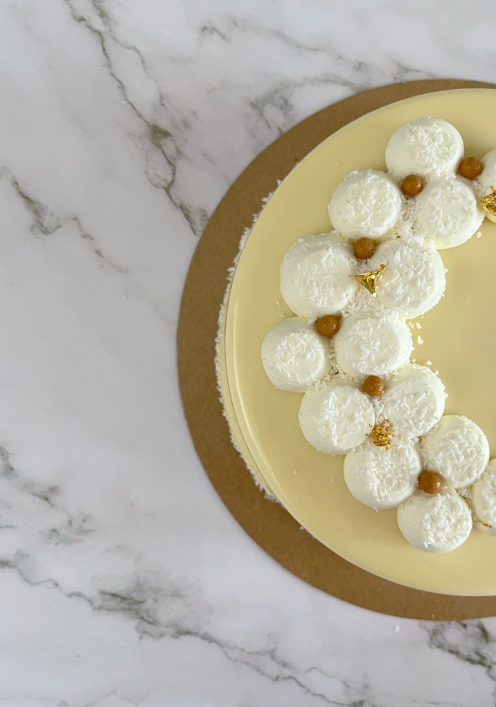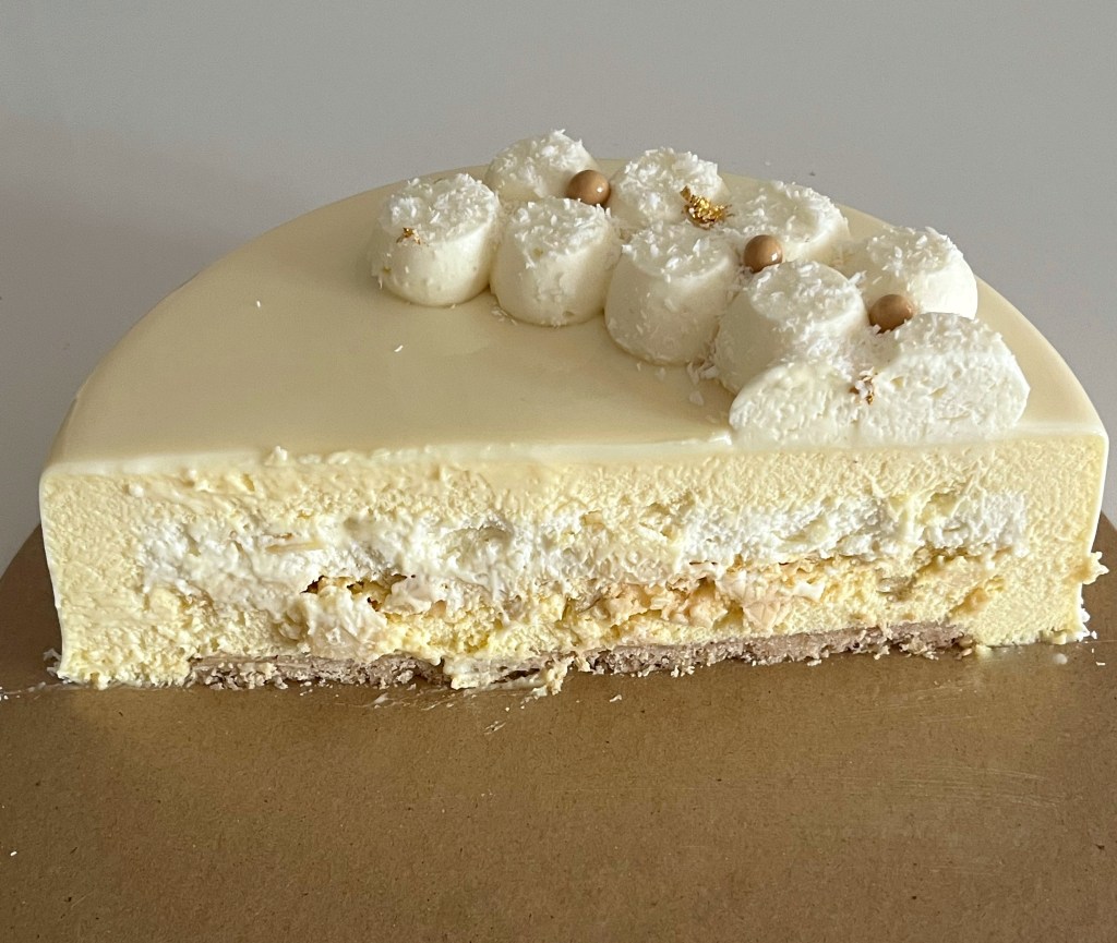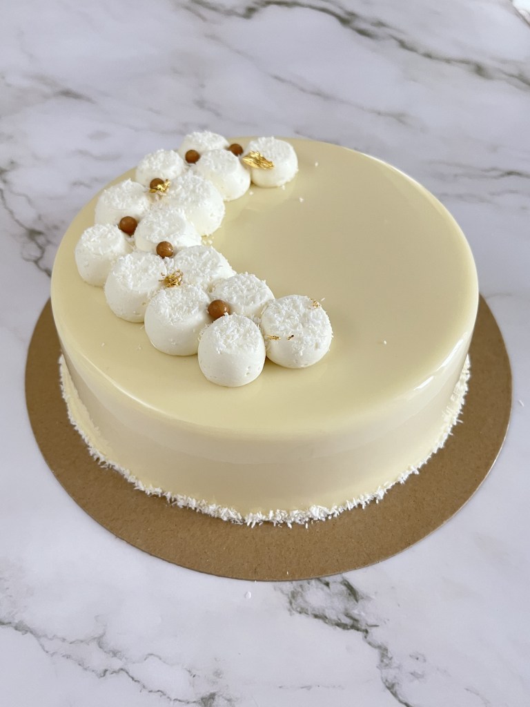 Questa torta è composta da una bavarese alla mandorla, da una mousse al cocco, cioccolato bianco e scaglie di mandorle e da una bavarese ai wafer alla vaniglia. La croccantezza è data dalla base di wafer alla vaniglia e cioccolato bianco. La torta è glassata con una glassa a specchio al cioccolato bianco e decorata con ganache montata alla vaniglia seguendo una tecnica che ho visto sul profilo di Irvin Pastry.
