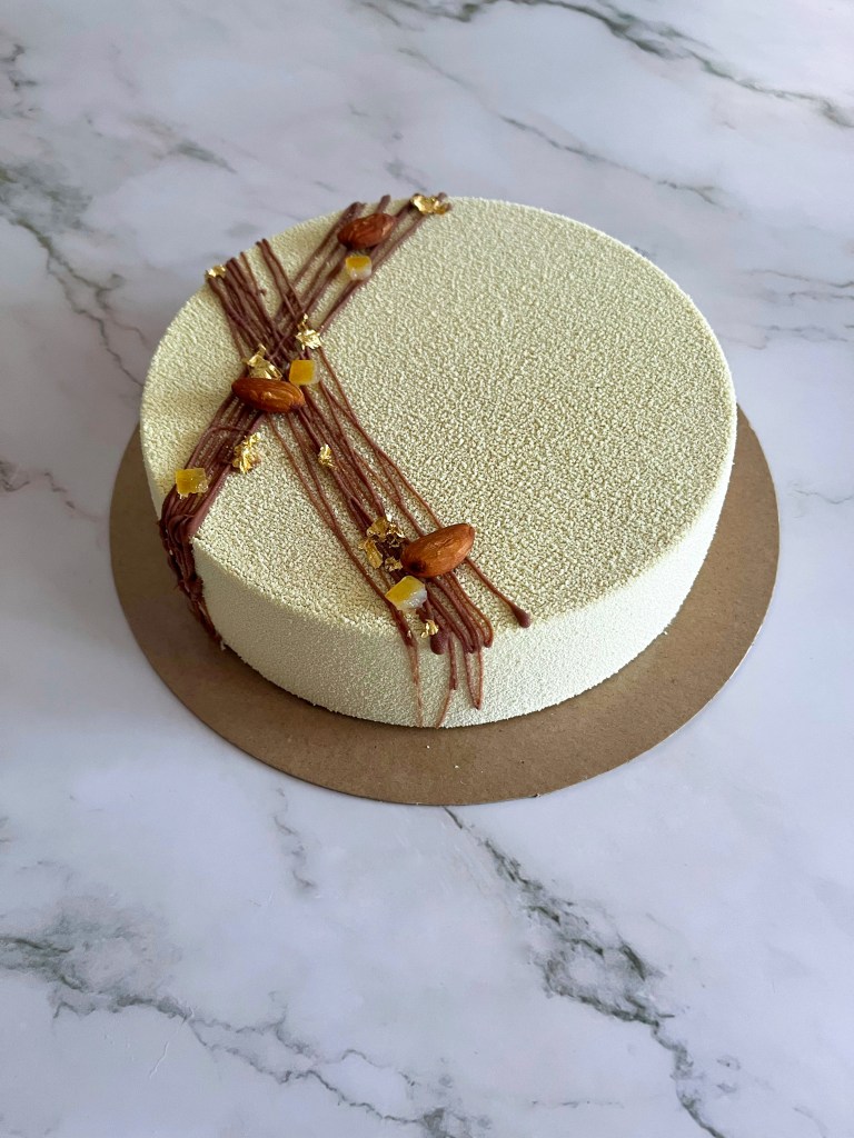 E’ un dolce che richiede un pò di passaggi, ma vi assicuro che, seguendo le tempistiche indicate, sarà semplice da realizzare e rimarrete molto soddisfatti! La torta si compone di: una bavarese al pralinato di mandorle che il dolce degli zuccherini e delle mandorle che si trovano sulla superficie della colomba, da una mousse alla colomba e da una ganache montata alla vaniglia, canditi e mandorle sabbiate. Ho poi inserito una base di biscotti e cereali per dare un pò di masticabilità al dolce e ho decorato con spray effetto velluto color burro e con delle strisce di cioccolato al latte fuso.