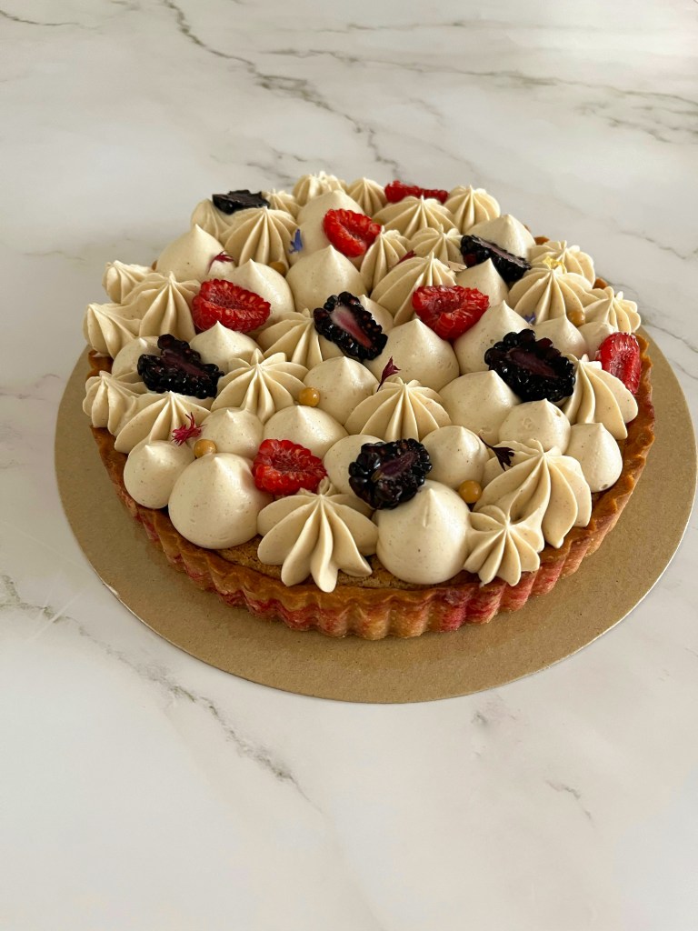 L’abbinamento nocciole e frutti di bosco è uno tra i miei preferiti in assoluto…secondo me sono gusti che sono nati per stare insieme! La corposità delle nocciole crea un bilancio di sapori perfetto con l’acidità dei frutti di bosco. Anche la decorazione di questa crostata è veramente semplice da realizzare; vi basterà dividere la namelaka in due sac a poche e utilizzare due beccucci diversi (in questo caso uno tondo e uno a stella) per dare movimento alla decorazione.