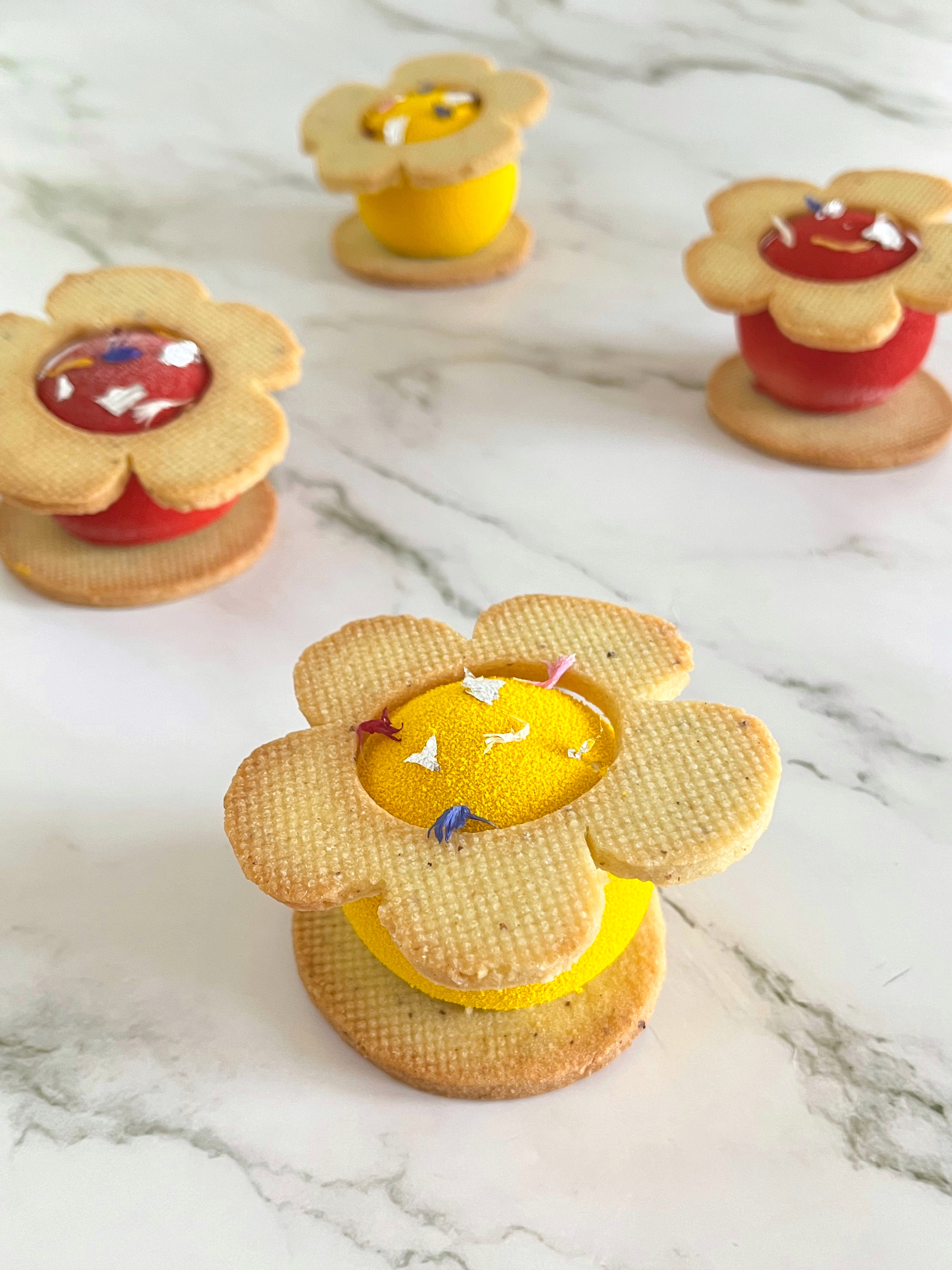 Vi propongo quindi queste mono porzioni floreali composte da: bavarese alla nocciola, confit di fragole, confit di mango, biscuit joconde e pasta frolla alla nocciola. Per realizzare questi dolcetti, mi sono ispirata a una creazione di Io e Brigante che aveva utilizzato le sfere e la frolla per creare dei coniglietti pasquali meravigliosi😍