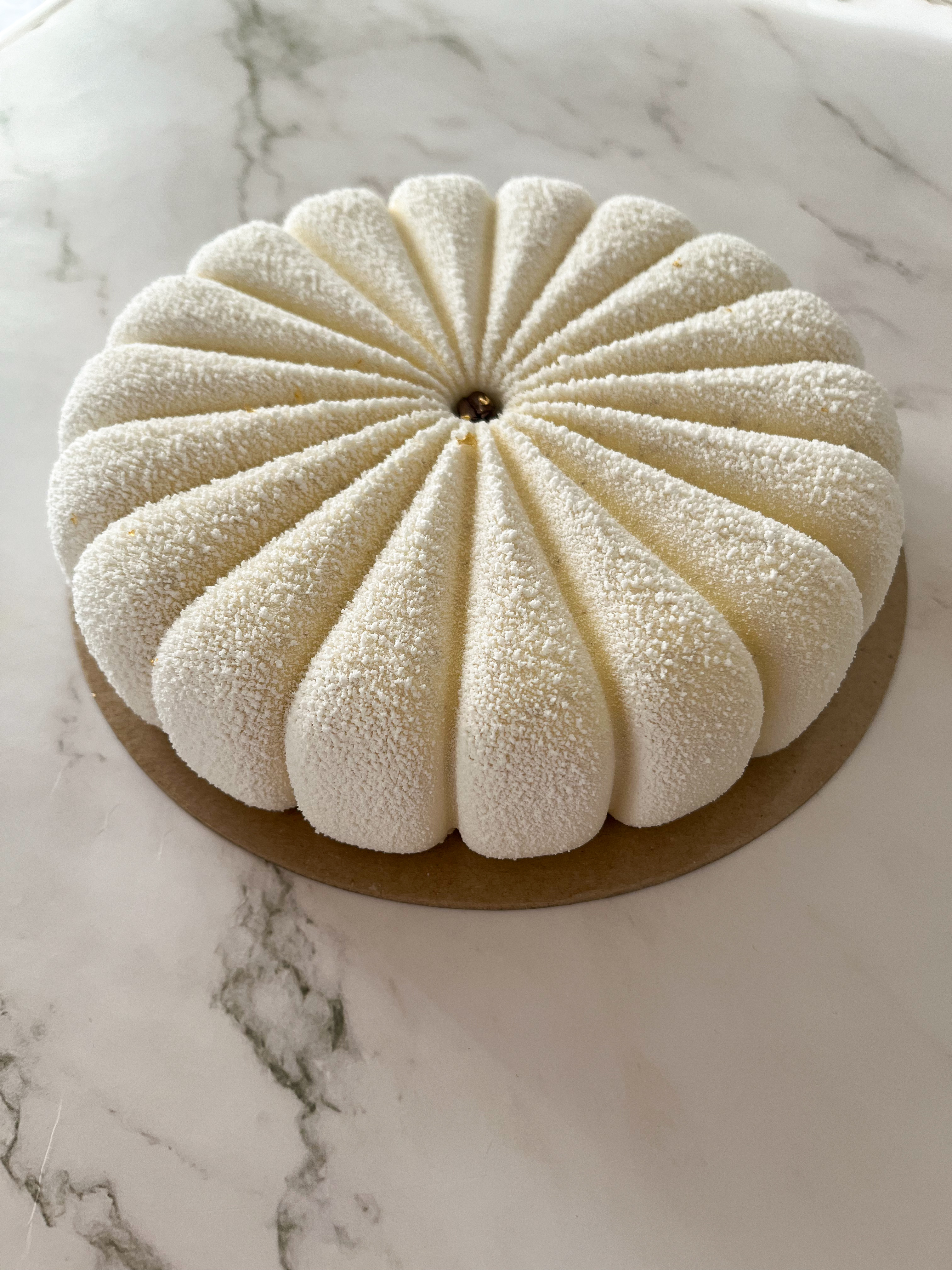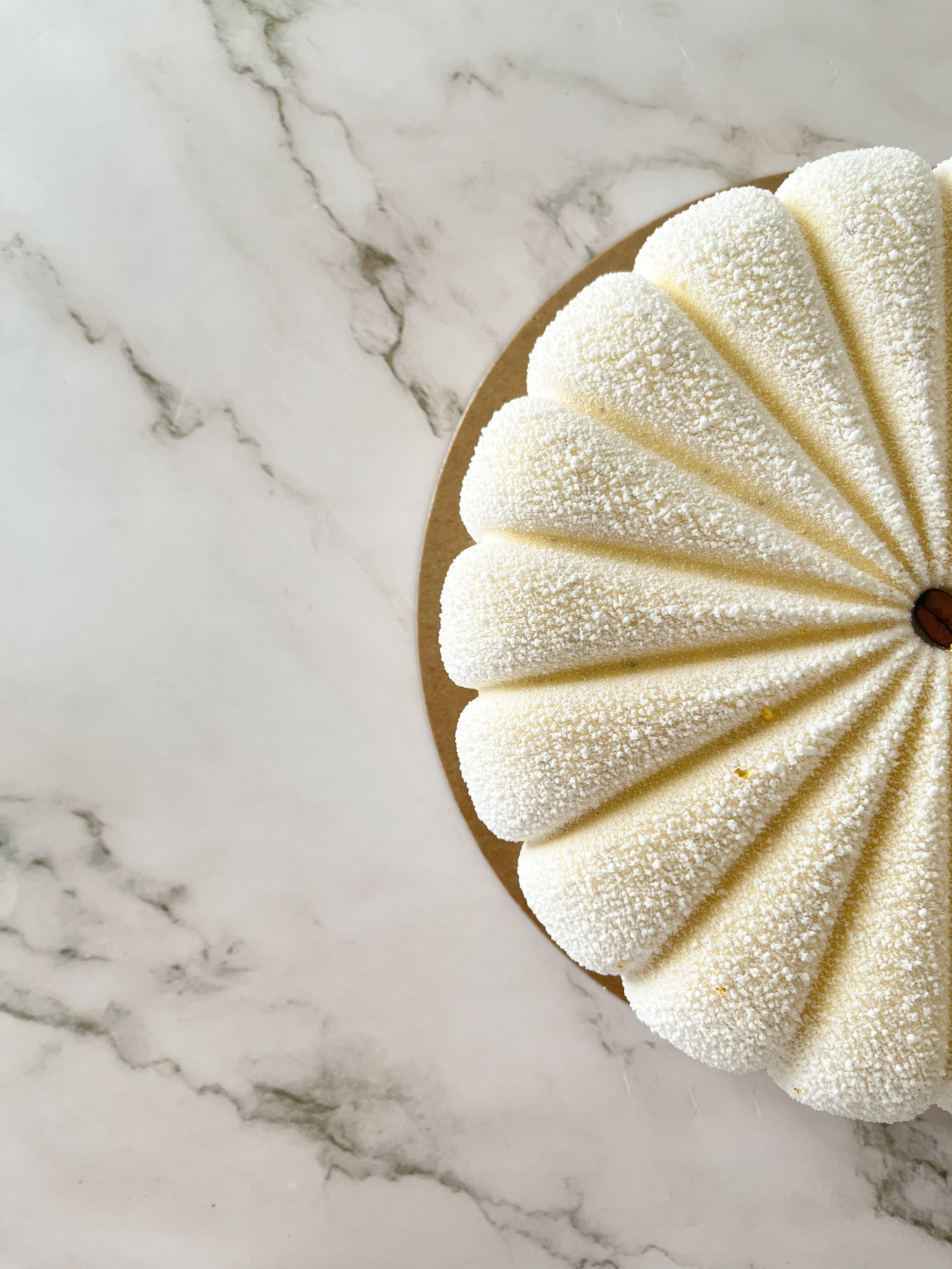 Questa torta moderna è composta da una bavarese al mascarpone, da una ganache al caffè, da una namelaka alla nocciola e da una base croccante di Digestive e cereali. Ho utilizzato lo stampo Maggie di Silikomart che mi ha subito colpita per la sua raffinatezza, e ho semplicemente decorato il dolce con spray effetto velluto bianco e un chicco di caffè al centro.