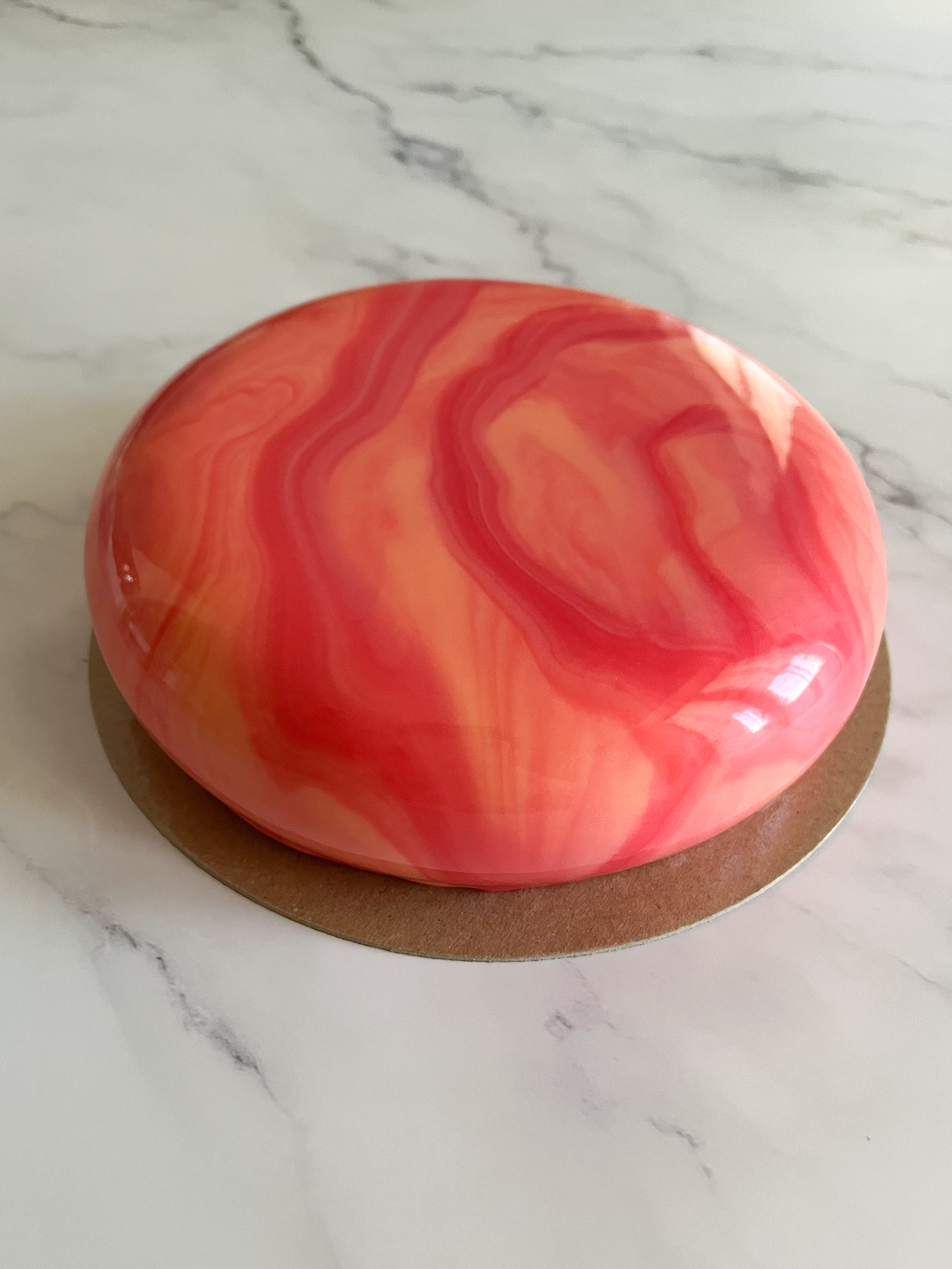 Ecco a voi questa torta che si compone di un confit alle pesche, un confit ai lamponi, da una bavarese alla mandorla e da un biscotto quattro quarti con lamponi e pesche fresche. Ho poi deciso di sperimentare per la prima volta una decorazione con la glassa a specchio con due colori e devo dire che l’effetto mi è piaciuto tantissimo!