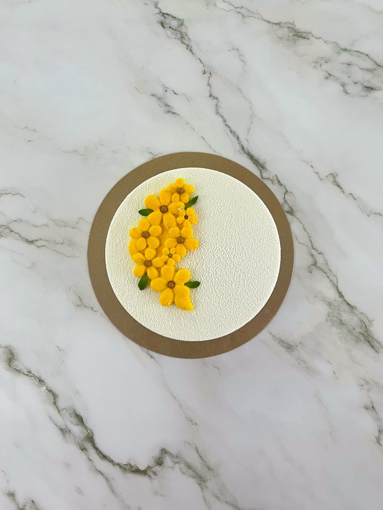 Per decorazione ho utilizzato lo stampo Flora80 di Silikomart, che io adoro perchè lo trovo molto elegante, che ho spruzzato con uno spray effetto velluto giallo che ricorda il colore del limone e del sole.