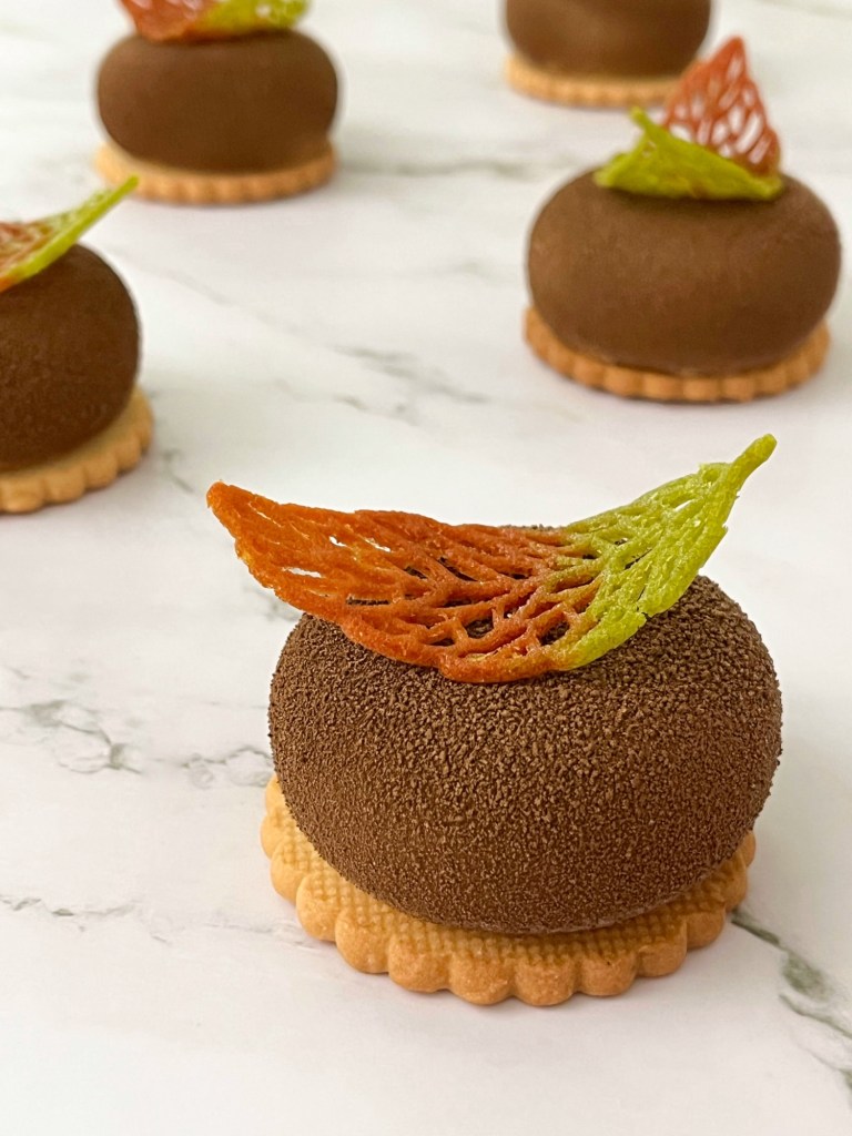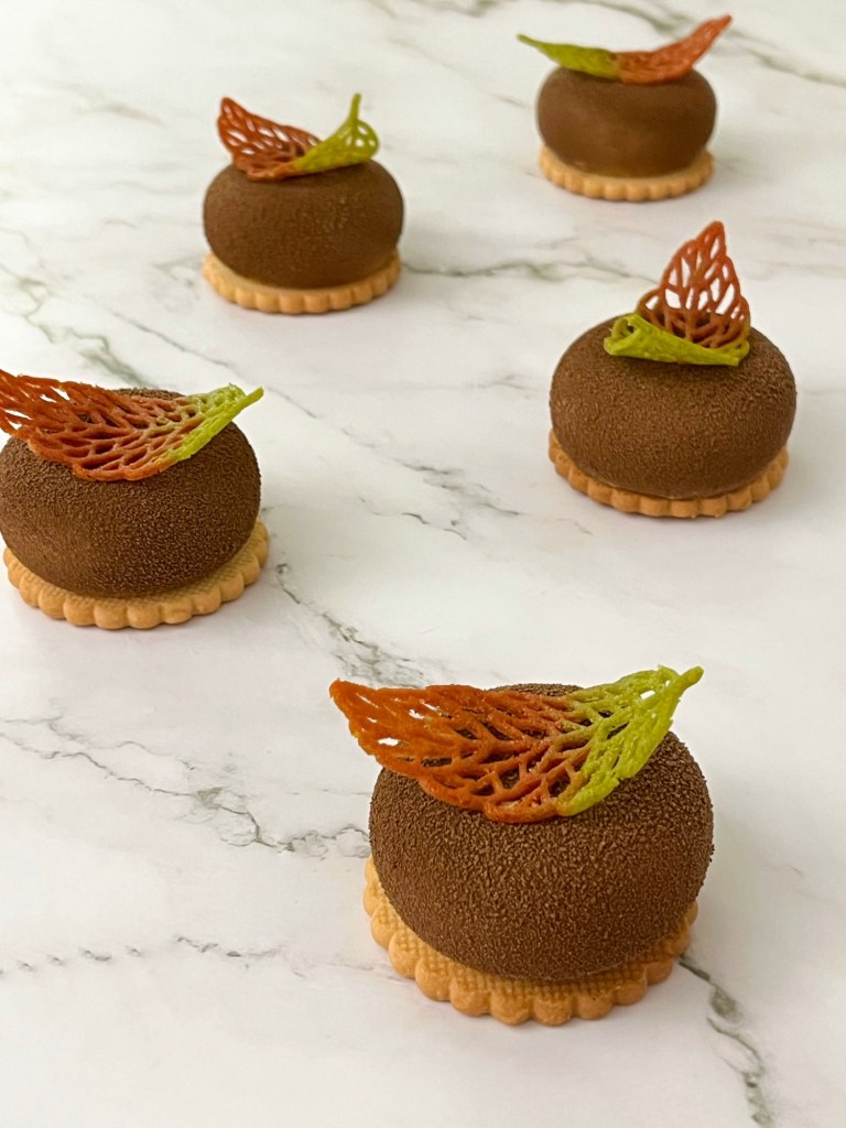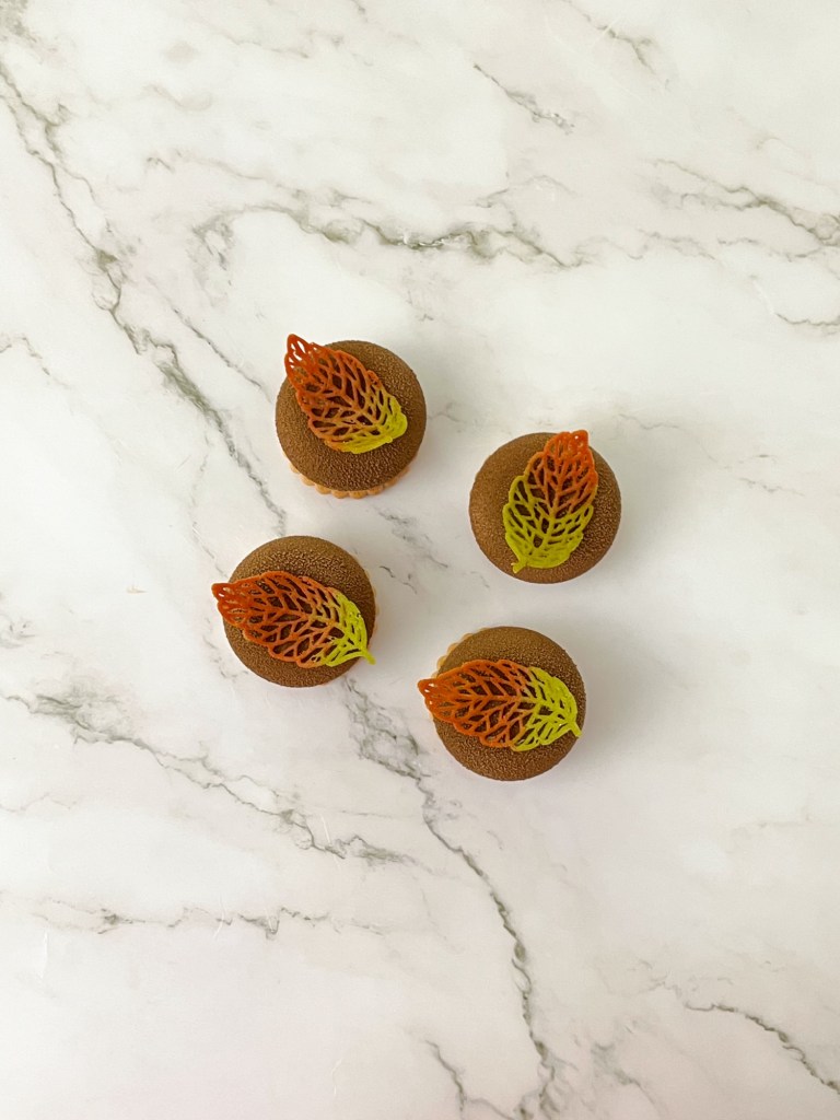 Ecco a voi quindi delle monoporzioni composte da una mousse alla zucca e da una mousse alla crema Novi, appoggiate su una base di pasta frolla. La decorazione è realizzata con spray effetto velluto e con foglie di Tuille che sono simbolo dell’autunno foglie 🍁