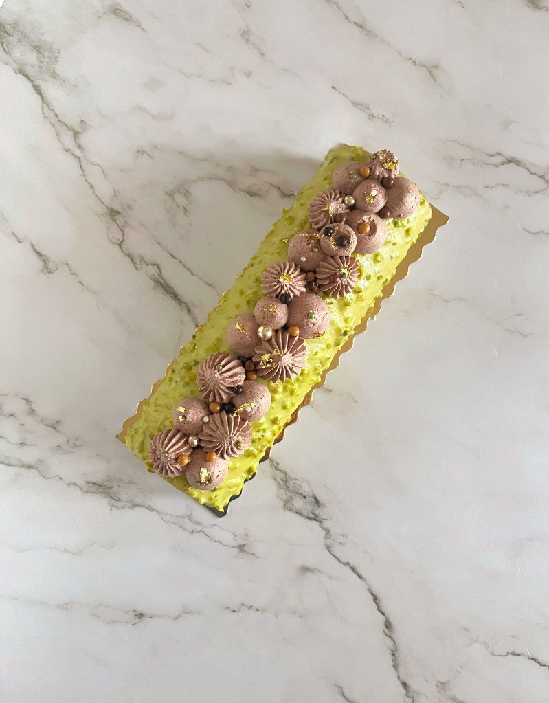 Questo dolce è composto da un inserto di bavarese al pistacchio, da una bavarese al cioccolato fondente e da una base croccante cioccolato e pistacchio. Il dolce è glassato con una glassa rocher al pistacchio e decorato con una ganache al cioccolato: una vero peccato di gola.