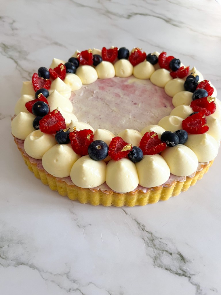 Vi propongo una crostata tiramisù ai frutti rossi composta da: una patèe sucree alla vaniglia e mandorle che racchiude una soffice crema al mascarpone (pastorizzata secondo il metodo di pasticceria in pillole), gel ai frutti rossi e savoiardi bagnati nel latte. La decorazione è realizzata allo stesso modo con la crema al mascarpone e frutti rossi freschi.
