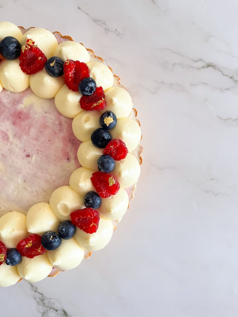 - Completate la decorazione con mirtilli e lamponi freschi e foglie oro alimentari.