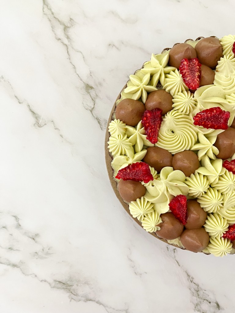 Questa crostata è composta da un guscio croccante di paté sucree al cacao, frangipane al pistacchio, confettura di lamponi e lamponi freschi, namelaka al cioccolato fondente e al pistacchio.