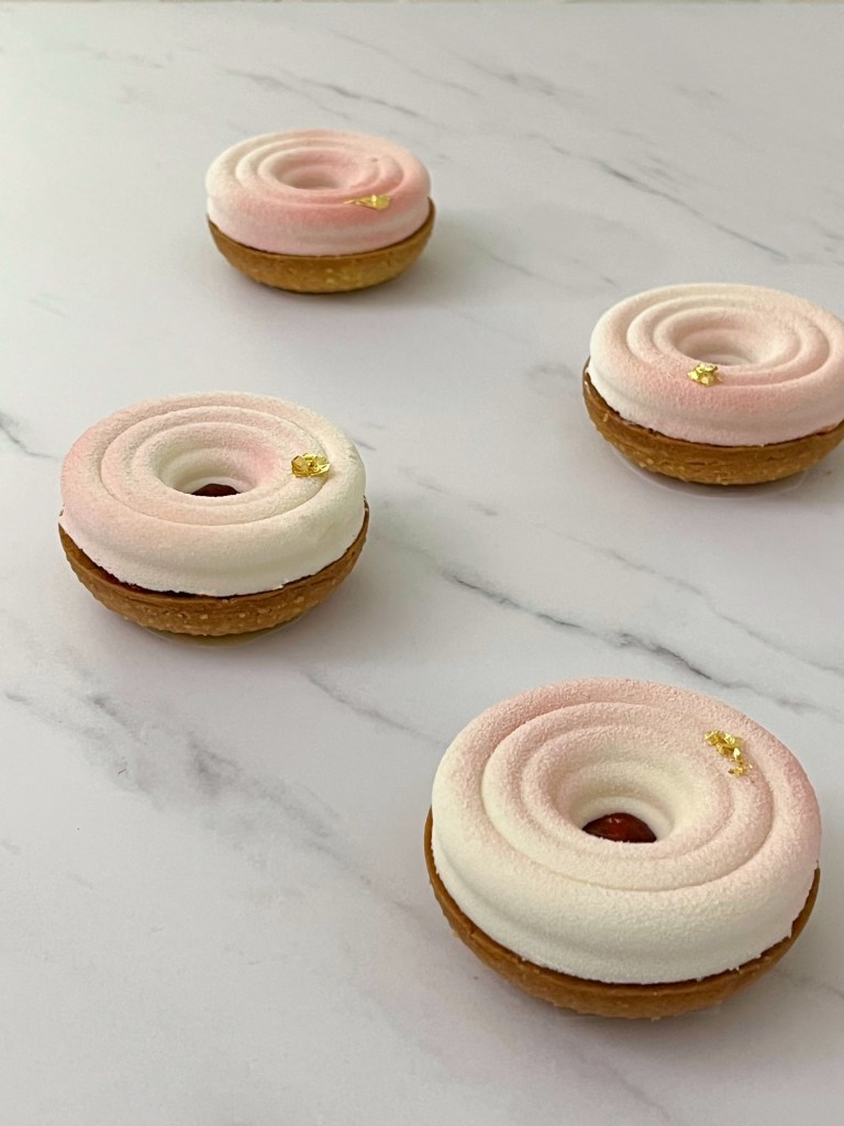 Oggi vi propongo quindi delle monoporzioni composte da: una base di paté sucrèe alle mandorle, ripiene di crema frangipane alle mandorle e fragole fresche sormontata da confettura di fragole. La decorazione è una mousse al cocco spruzzata con spray effetto velluto bianco e rosa.
