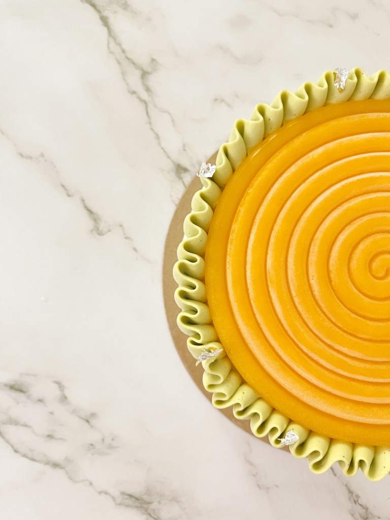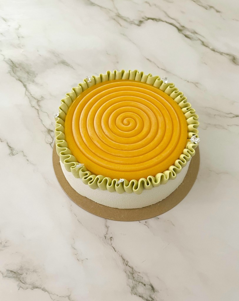 Vi propongo questo abbinamento con questa torta moderna composta da: un inserto di crema Philadelphia e un confit al mango, avvolto da una soffice mousse al pistacchio e cioccolato bianco. La decorazione è realizzata con una spirale di gelee al mango e una namelaka al pistacchio.