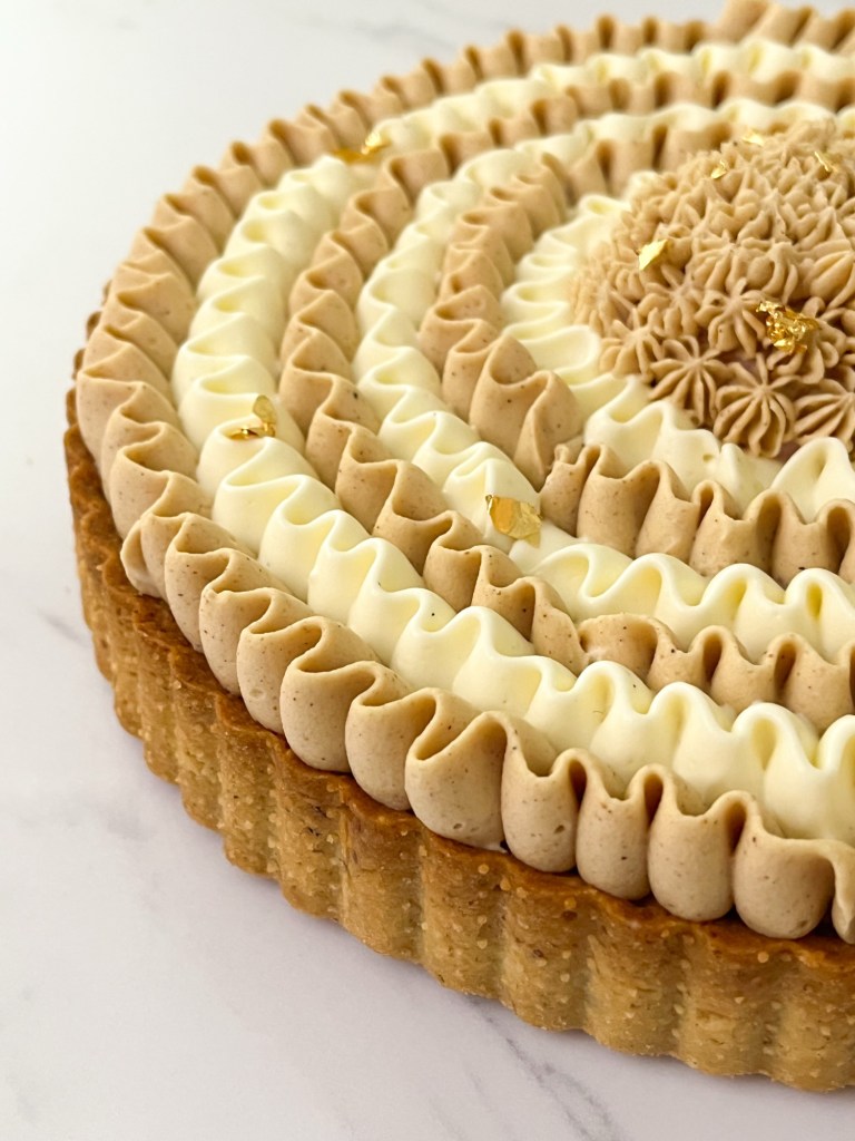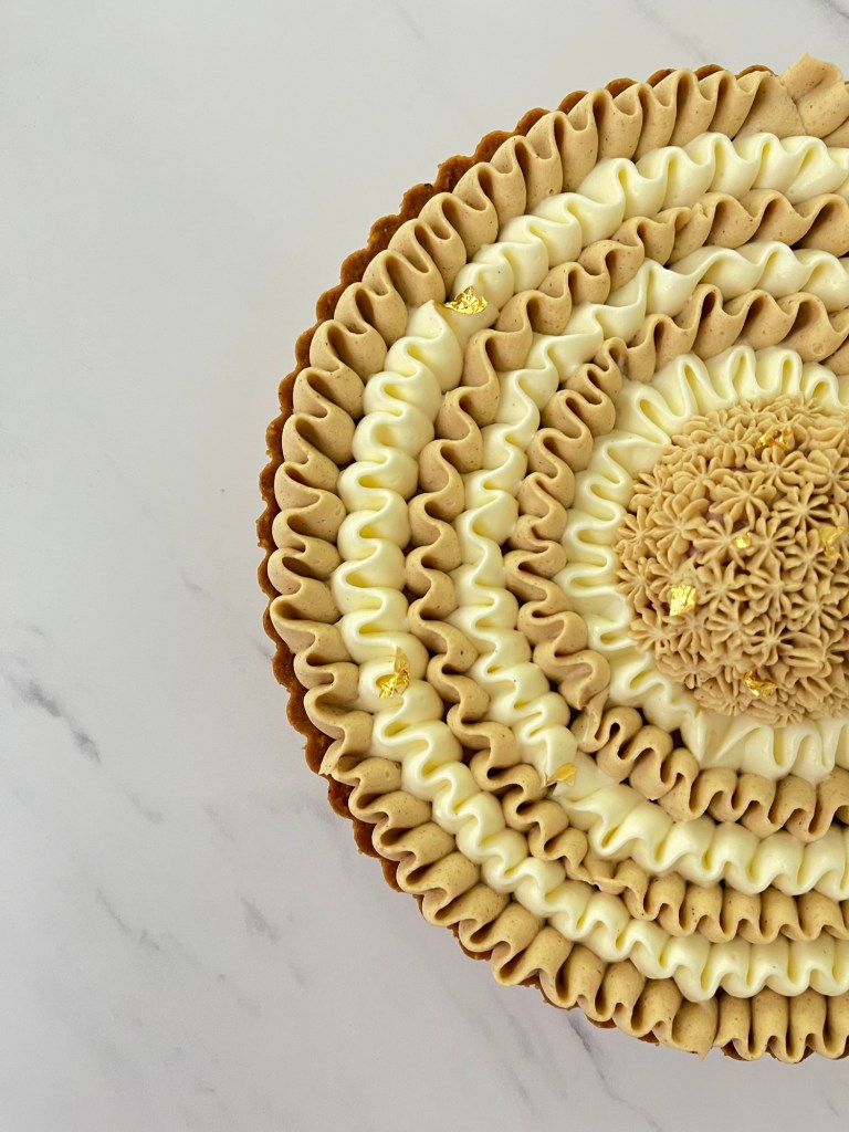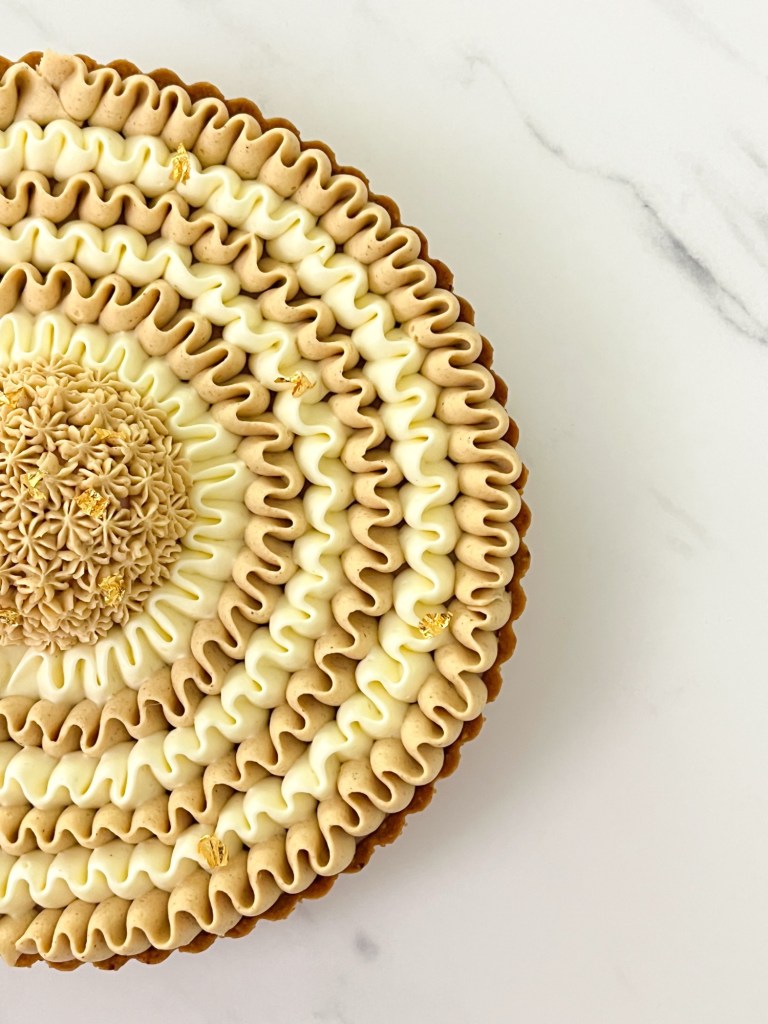 - Procedete con la decorazione che vedete realizzata in foto, alternando ganache alla vaniglia e namelaka alla nocciola
