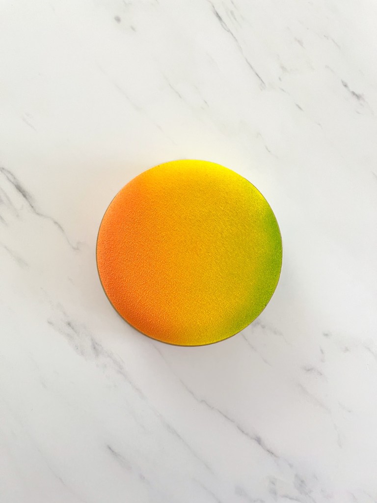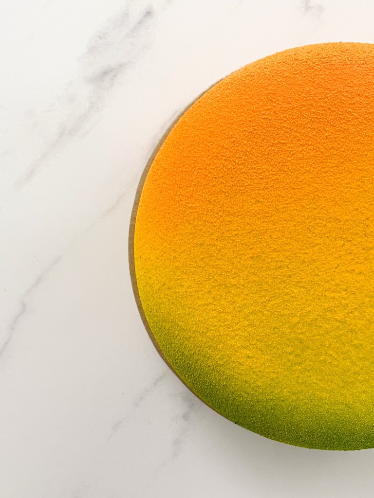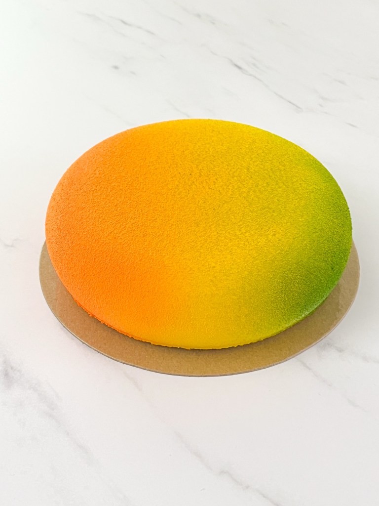- Estraete dal freezer la vostra torta e decoratela con lo spray effetto velluto giallo, verde e arancione realizzando una sfumatura che ricorda il mango.