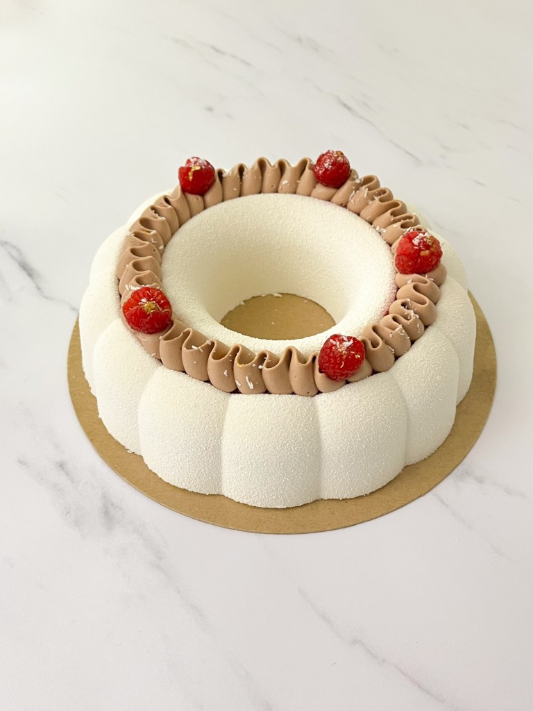 - Estraete dal freezer l’inserto di namelaka e coulis ai lamponi e inseritelo nella mousse al cocco.
