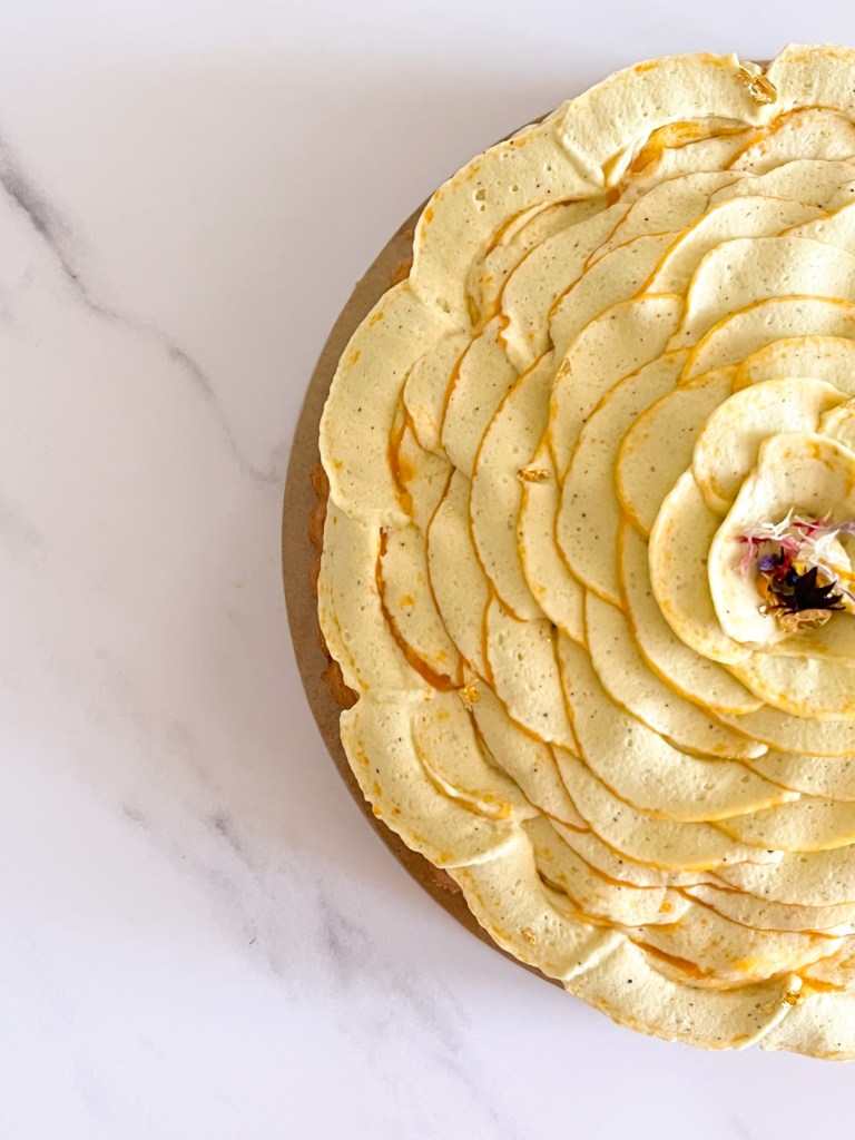 - Prendete 3-4 cucchiai di namelaka e metteteli al centro della vostra torta, creando una sorta di “piccola cunetta” che vi servirà a dare tridimensionalità alla decorazione. Unite anche altro confit di albicocche e livellate bene per ottenere una superficie liscia.