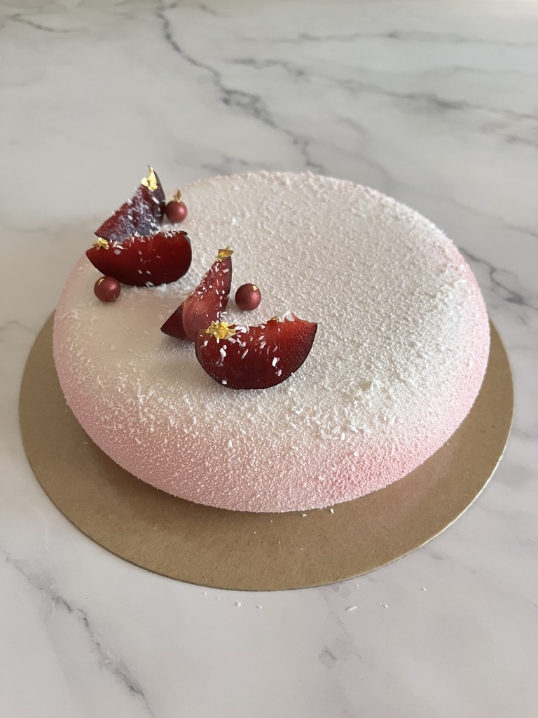 Questo dolce è composto da un inserto di confit alle susine, immerso in una mousse al cocco. La base è realizzata con i digestive, mentre la decorazione con spray effetto velluto.