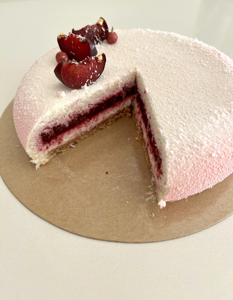 Oggi vi propongo una torta moderna con protagonisti il cocco e le susine😋 è un dolce dai sapori freschi e molto semplice da realizzare perché ha solo tre preparazioni.