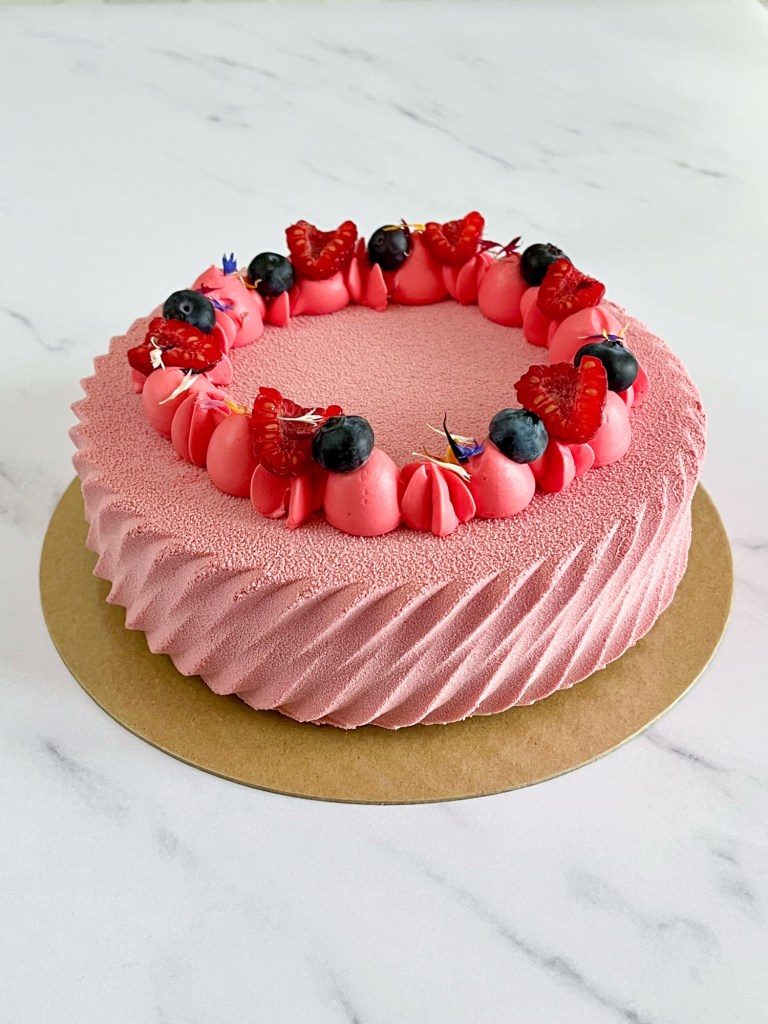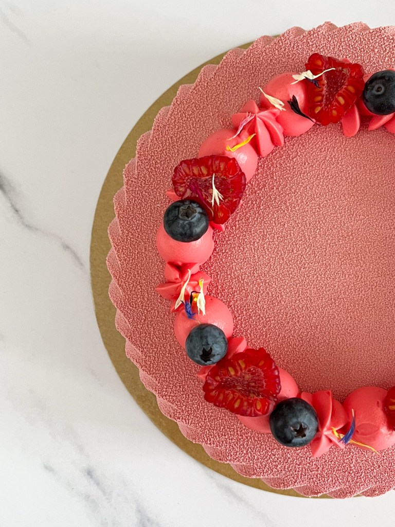 Per questa torta ho realizzato un inserto di mousse ai frutti di bosco e ganache alla vaniglia, che si incontra con una mousse al cioccolato Ruby. La base croccante è realizzata con biscotti Digestive, mentre per decorazione ho optato per una ganache alla vaniglia, che avrei voluto colorare con un rosa pastello, ma qualcosa è andato decisamente storto, ed ho abbracciato nuovamente la mia “Barbie era”😉