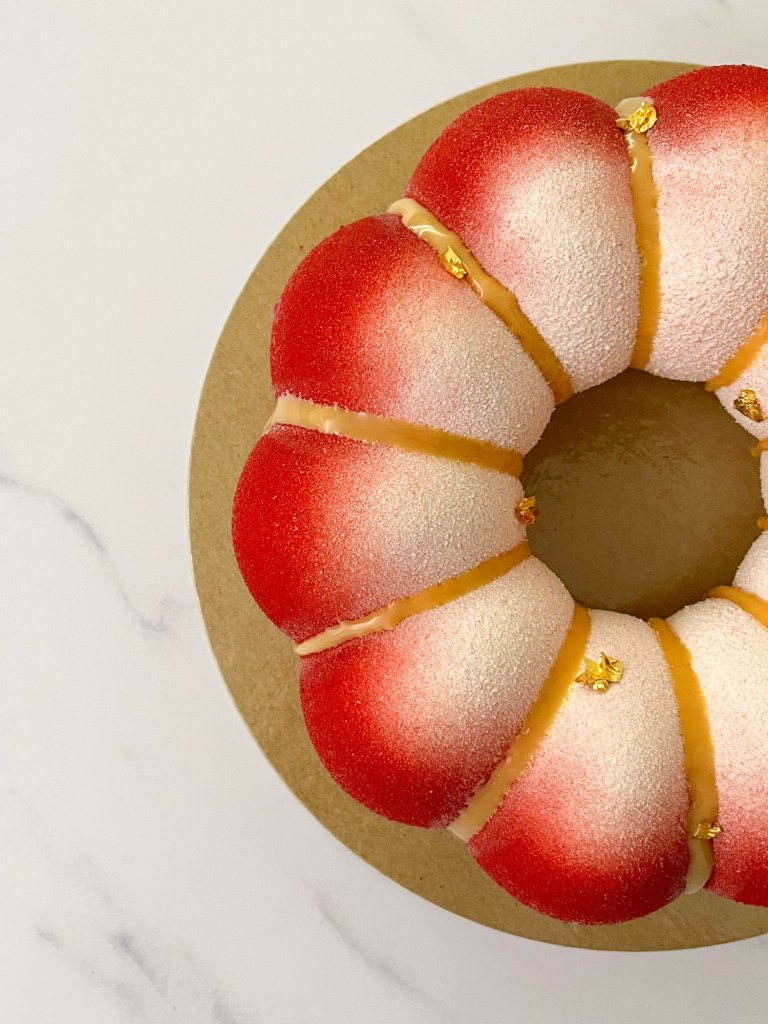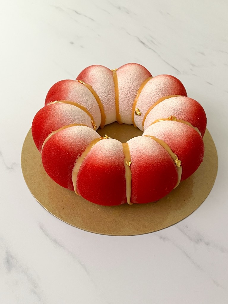 Iniziamo con un entremet composto da un inserto di confit alle fragole e caramello, avvolto da una soffice mousse allo yogurt. La base è un sofficissimo biscuit joconde e la decorazione è realizzata con spray effetto velluto rosso e bianco 🥰