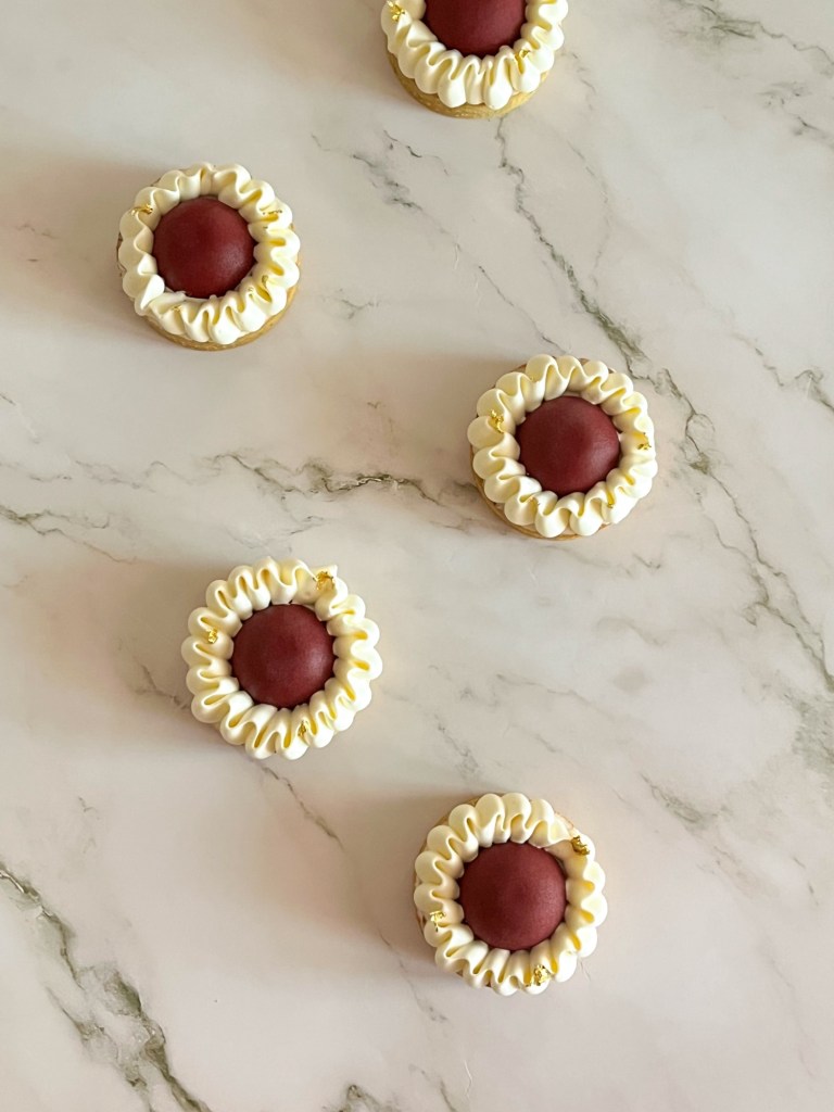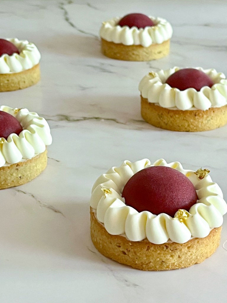 Queste crostatine si compongono di un guscio di paté sucrèe alle noci e sono ripiene di una crema frangipane alle noci e frutti rossi freschi, sulla quale è adagiato un confit di lamponi e mirtilli. La decorazione è realizzata con ganache alla vaniglia 😋