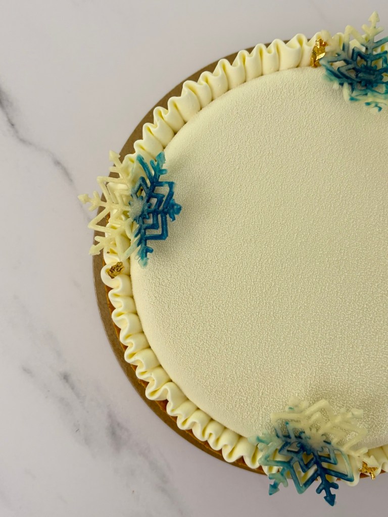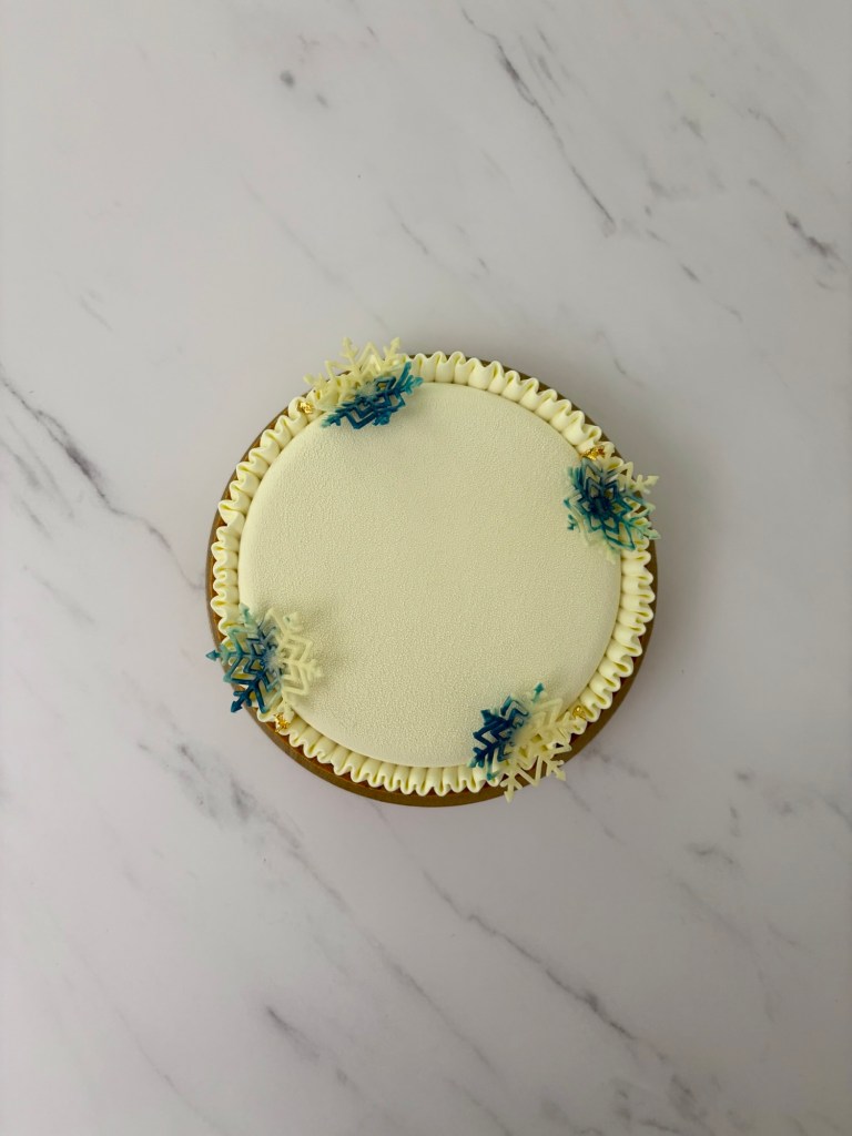- Decorate l’esterno della mousse con la ganache alla vaniglia per ricreare l’effetto che vedete in foto.