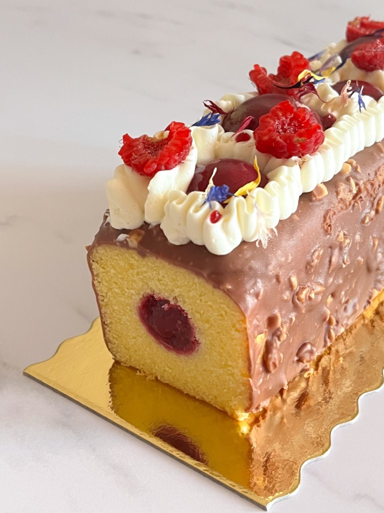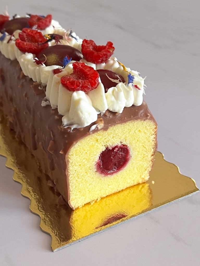 Per festeggiare le temperature un po’ più “calde” e le giornate che si allungano, vi lascio questo dolce composto da un soffice cake alla vaniglia ripieno di un confit ai lamponi e mirtilli e sormontato da glassa rocher e ganache alla vaniglia 😋